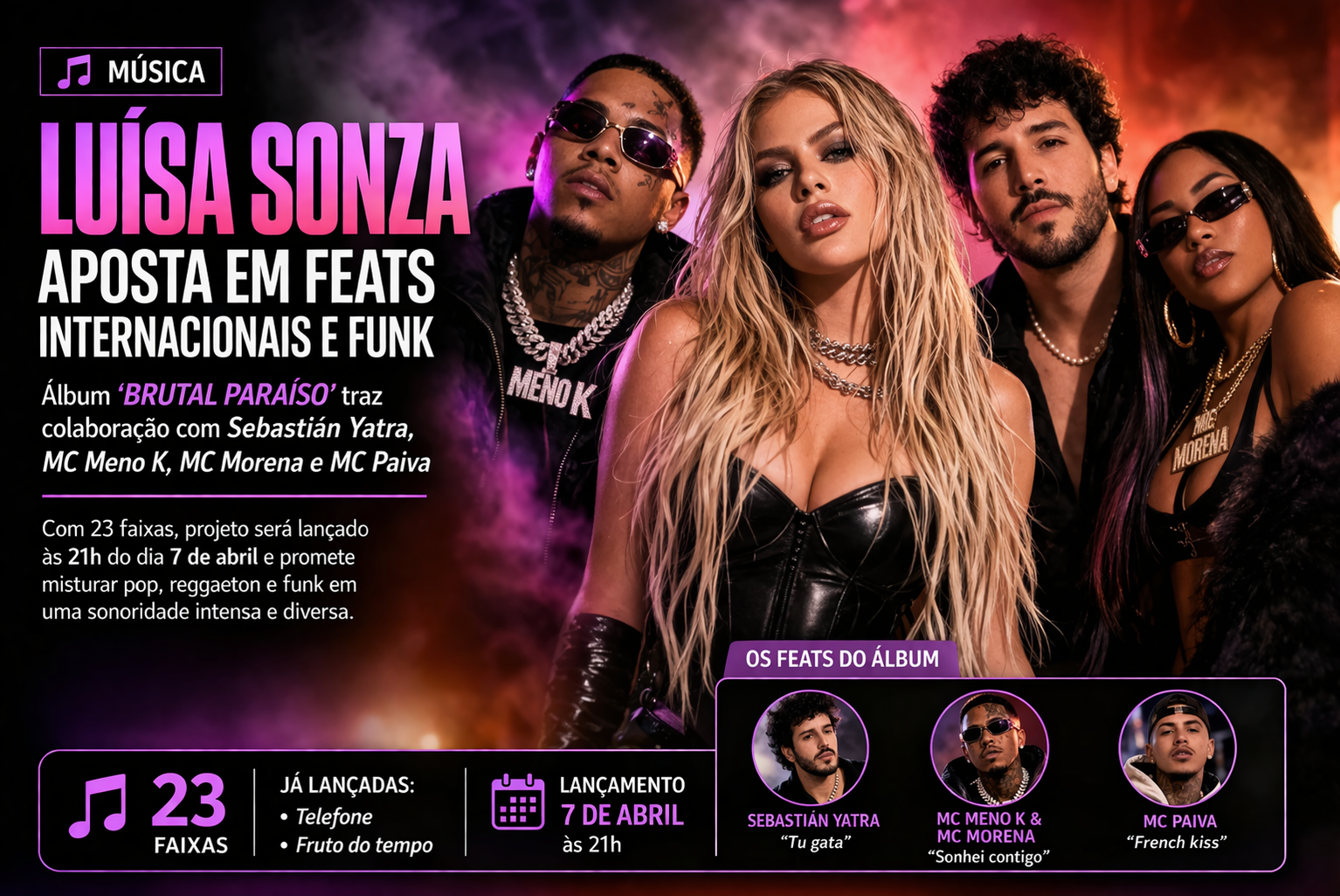 A cantora Luísa Sonza prepara um lançamento de peso para movimentar o cenário pop nesta semana. O novo álbum “Brutal paraíso”, que chega às plataformas às 21h do dia 7 de abril, promete reunir uma mistura de estilos e colaborações estratégicas — incluindo nomes do funk nacional e do pop latino. Entre os destaques do […]