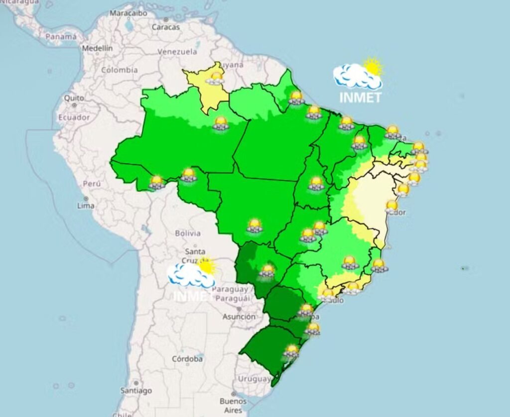 No Nordeste, as precipitações devem ocorrer com maior frequência na faixa entre Maranhão e Rio Grande do Norte. Já em outras áreas da região, o tempo permanece mais estável, com predomínio de sol e temperaturas acima dos 30 °C em várias capitais.