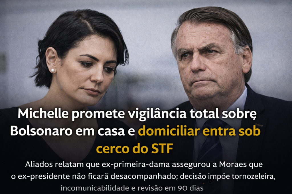 A prisão domiciliar humanitária concedida a Jair Bolsonaro passou a ser cercada por um esquema rígido de controle judicial e acompanhamento permanente. Segundo relatos de aliados após reunião de Michelle Bolsonaro com o ministro Alexandre de Moraes, a ex-primeira-dama assegurou que o ex-presidente não ficará sozinho durante o período em casa, numa tentativa de reforçar ao Supremo a necessidade de vigilância contínua diante do quadro de saúde dele.